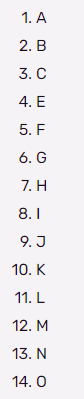 {{Pyramid chart | section 1 = A | section 2 = B | section 3 = C | section 4 = D | section 4 = E | section 5 = F | section 6 = G | section 7 = H | section 8 = I | section 9 = J | section 10 = K | section 11 = L | section 12 = M | section 13 = N | section 14 = O }}
